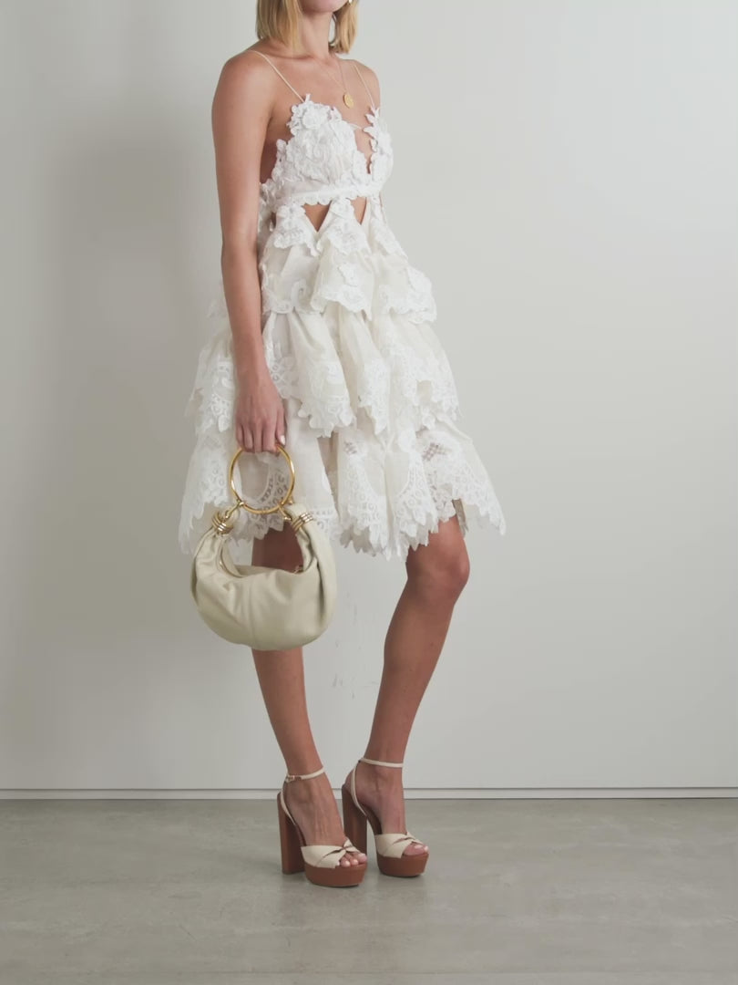 Crush Minikleid aus einer Leinen-Seidenmischung mit Spitzenbesätzen, Rüschen und Stufen